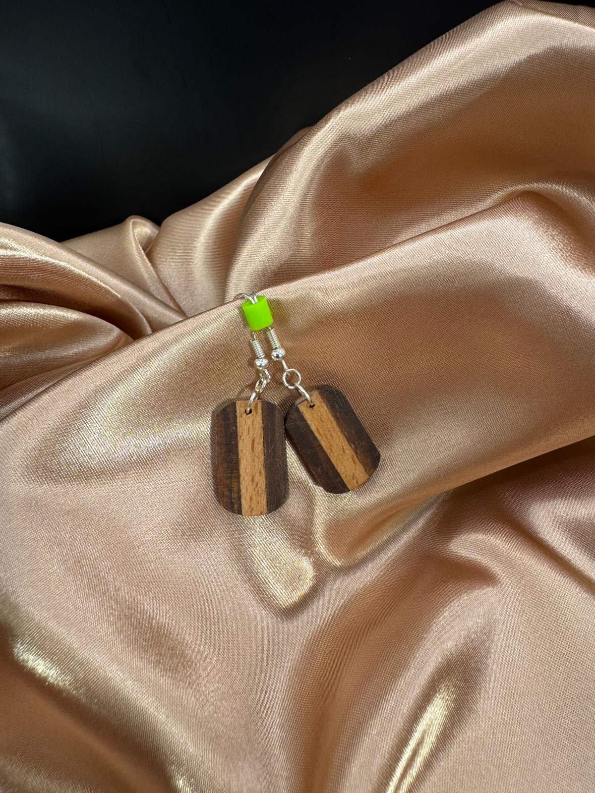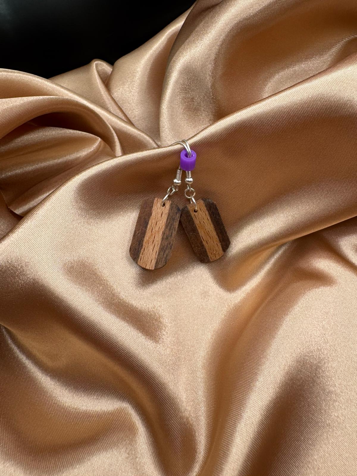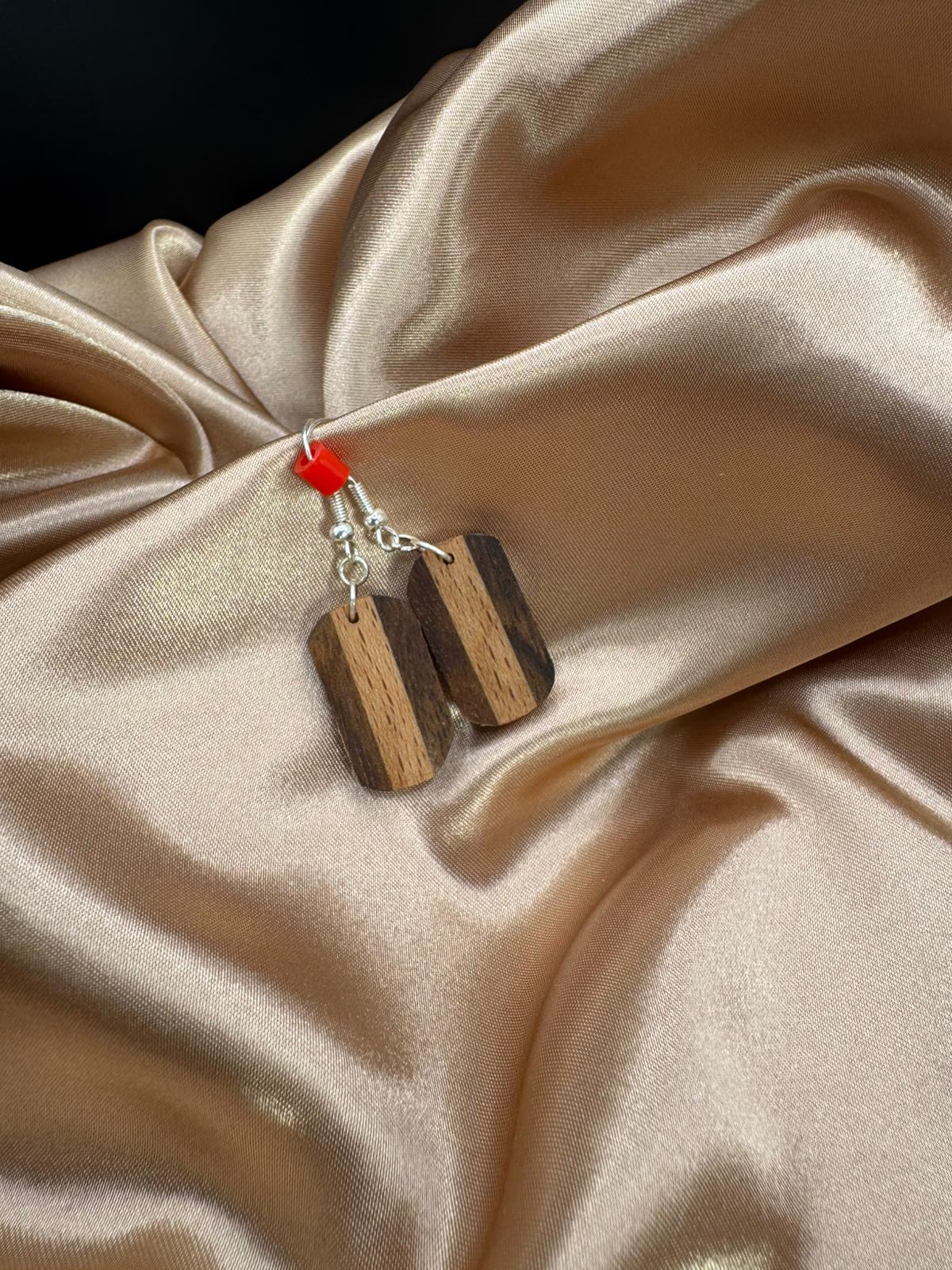 Les boucles d'oreilles sont réalisées en bois de hêtre, et noyer.